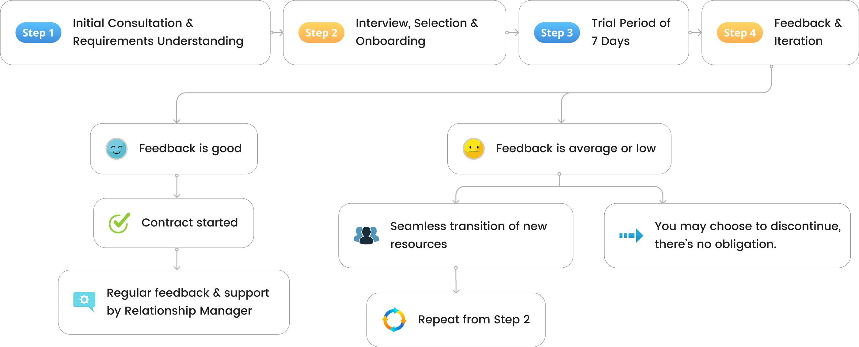 To hire software developers from India is a big decision. That's why we offer a 7-day free trial, allowing you to experience our developers' expertise and assess their fit before committing to a contract. It's a risk-free way to hire coders India and explore the potential of our services.